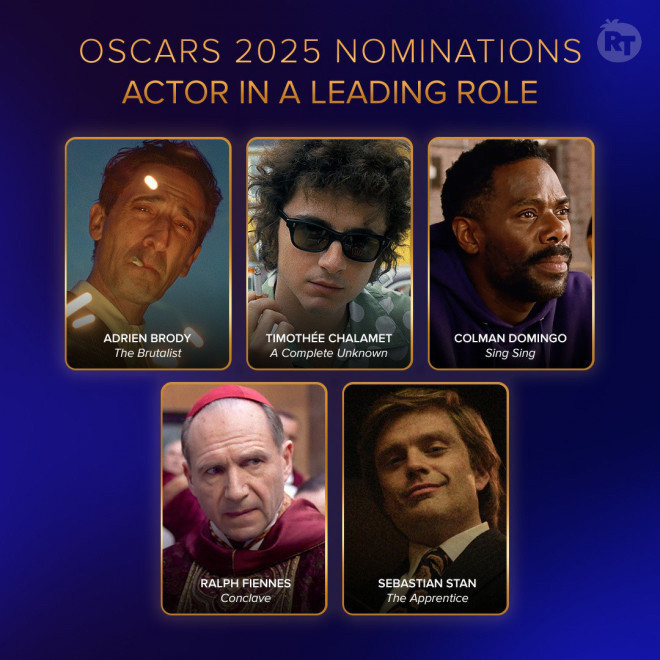 提莫西·查拉梅凭借在传记片《无名小辈》中饰演鲍勃·迪伦获得最佳男主角提名。他将与《粗野派》的阿德里安·布罗迪对决,后者凭借电影《钢琴家》,在29岁时成为历史上最年轻的奥斯卡影帝。其他获得最佳男主角提名的演员还包括科尔曼·多明戈(《监狱剧院》)、拉尔夫·费因斯(《秘密会议》)和塞巴斯蒂安·斯坦(《飞黄腾达》)。