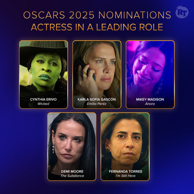 影后部分,先前在金球奖上凭借《某种物质》摘得最佳女主角的黛米·摩尔再下一城。除了摩尔,辛西娅·艾莉佛(《魔法坏女巫》)、卡拉·索菲娅·加斯科恩(《艾米莉亚·佩雷斯》)、米奇·麦迪森(《阿诺拉》)、费尔南达·托里斯(《我仍在此》 )均位列最佳女主角提名名单。